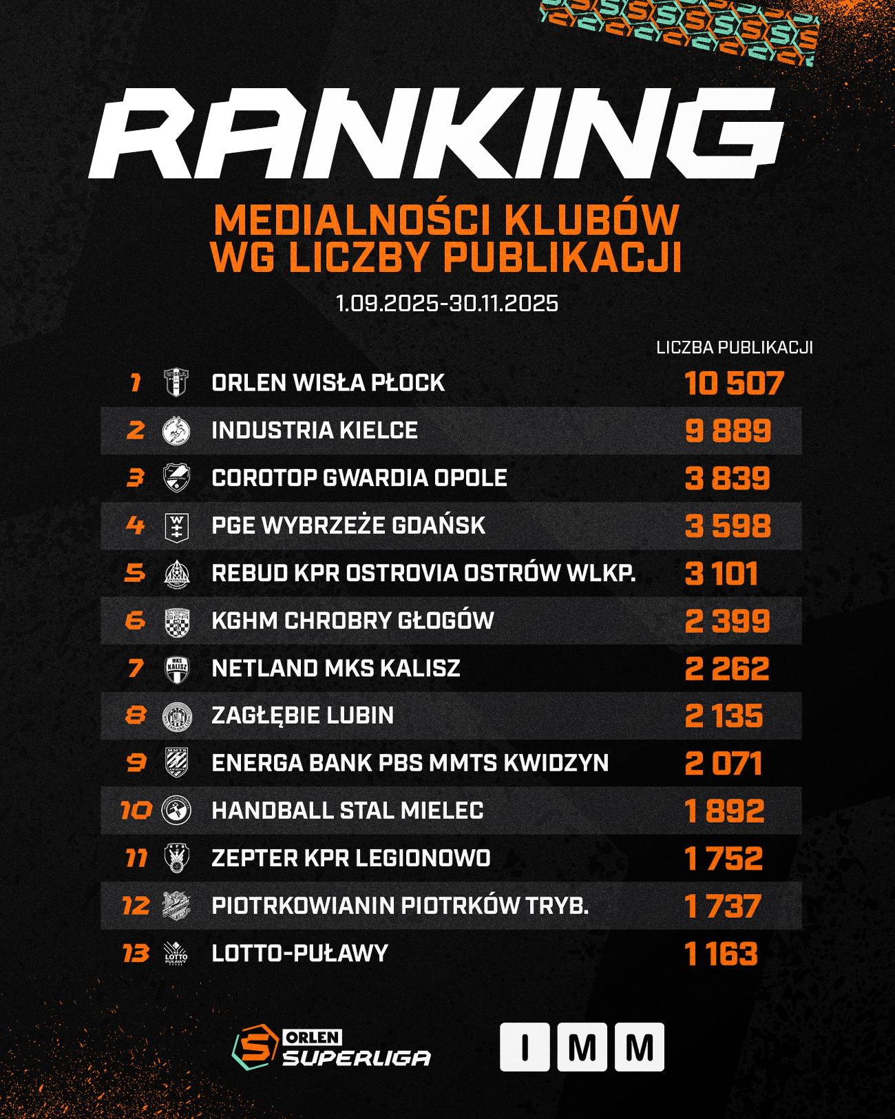 Instytut Monitorowania Mediów (IMM) przygotował raport medialności klubów ORLEN Superligi i ORLEN Superligi Kobiet za okres od 1 września do 30 listopada 2025 roku. Podsumowanie obejmujące prasę, radio, telewizję, Internet oraz media społecznościowe pokazuje duże zainteresowanie rozgrywkami w przestrzeni medialnej.
